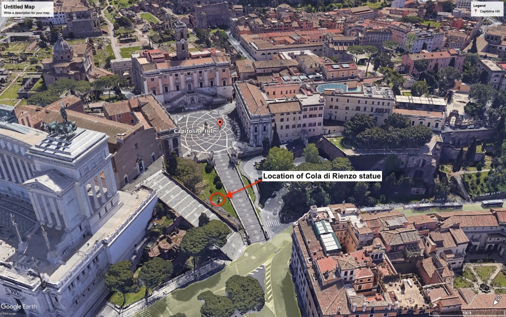 Bird’s eye view of Capitoline hill; Cola di Rienzo statue indicated