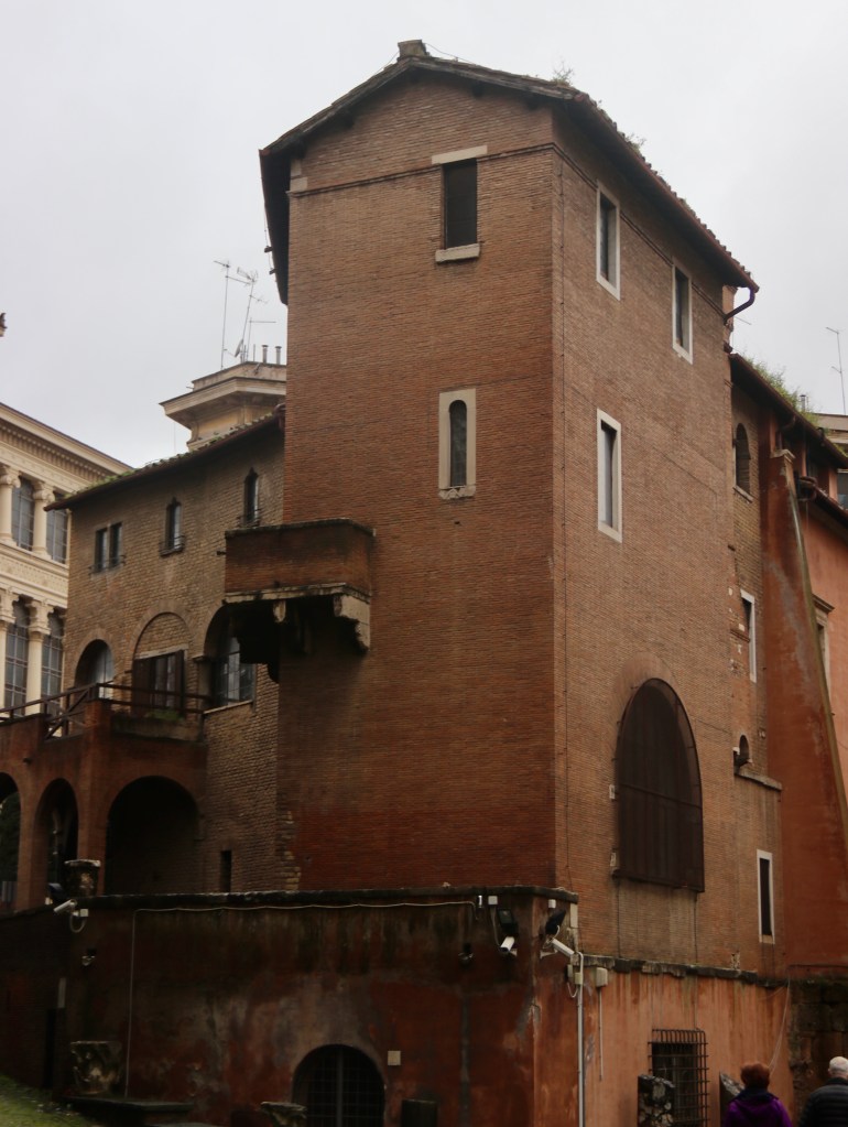Into the fray stepped Cola di Rienzo. Fashioning himself as a protector of the people, he convinced a number of local merchants and lower nobles to wrest control of the city’s government from the ruling families. On May 18, 1349, the Friday before Pentecost, Cola met at a secret location on the Aventine Hill with his one hundred “good men.” From there they marched down to the Church of Sant’Angelo in Pescheria just behind the remaining arch of the Portico d’Ottavia and by the then active fish market. This was Cola’s neighborhood and many of his followers lived close by. These included the Vallati whose reconstructed house is across the square from the Church of Sant’Angelo, the Savelli who controlled the palace built on top of the Theater of Marcellus, and the Cenci whose compound was also near to the fish market.