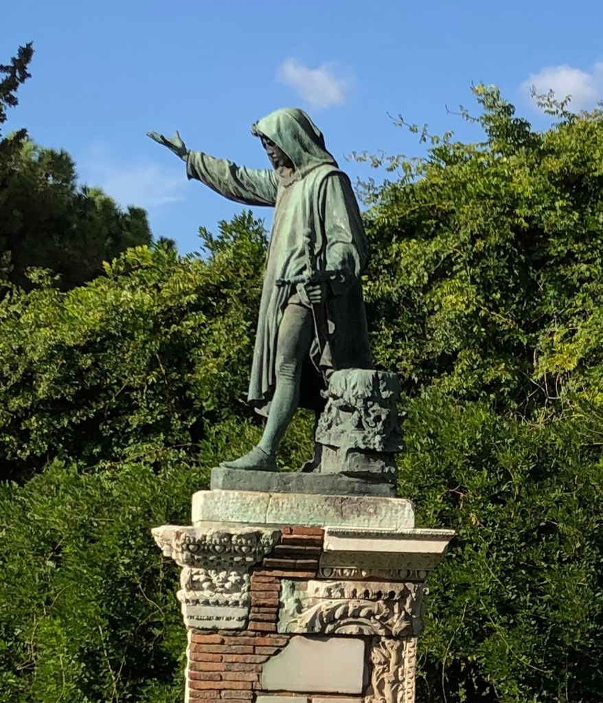 Erected in 1887, the statue honors the papal notary who took on Rome’s nobility in the early modern period, declared himself Tribune of the people and led a short-lived revolt that turned the city on its ear. Born in 1313, Cola was raised about 500 yards south-east of the Capitoline along the Tiber where his father had a tavern. A self-taught classicist, Cola was a friend of the great Tuscan scholar and poet Petrarch and the two maintained a lively correspondence. In 1344, Cola di Rienzo served as a notary at the papal court of Pope Clement VI then located in Avignon. With the papacy in France, Rome was in the hands of warring Nobles who made life miserable for the populace. As the anonymous contemporary biographer of Cola wrote : “[T]he city of Rome was in agony. It had no rulers; men fought every day; thieves were everywhere; nuns were insulted; there was no refuge; unwed orphans were assaulted and led away in dishonour; wives were taken from their husbands in their very beds; laborers going out to work were robbed, and where? Within the gates of Rome!”