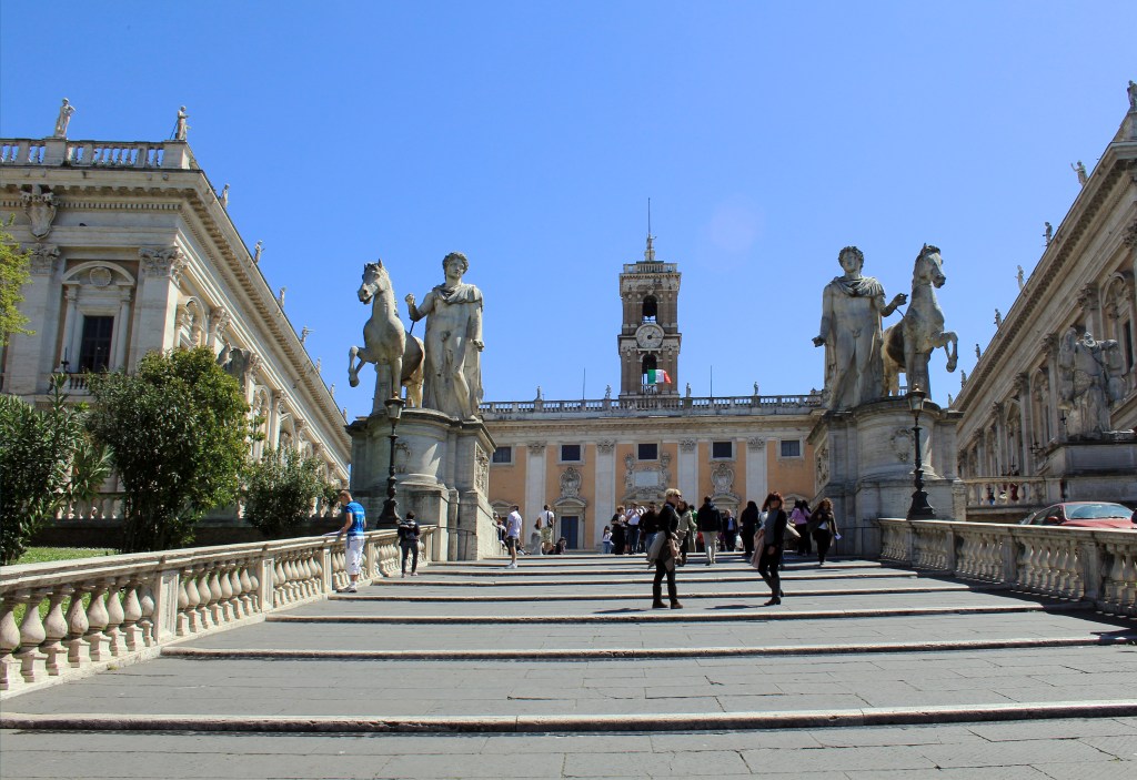 Facing the twenty-three wide carriage stairs, or cordonata, that lead to the plateau of the Capitoline Hill, the visitor to Rome is captured by the grandeur of the vista. Staring down from the top are the two ancient marble horsemen, Castor and Pollux, with their steeds. Just beyond, the Palazzo Senatorio flanked by the Capitoline Museums frame the plaza designed by Michelangelo and act as embracing arms to the observer below. Completing the justifiably impressive view is the much steeper staircase rising to the viewer’s left to the 12th-century Basilica di Santa Maria in Ara Cœli and still further left is the massive monument to Victor Emmanuel II.